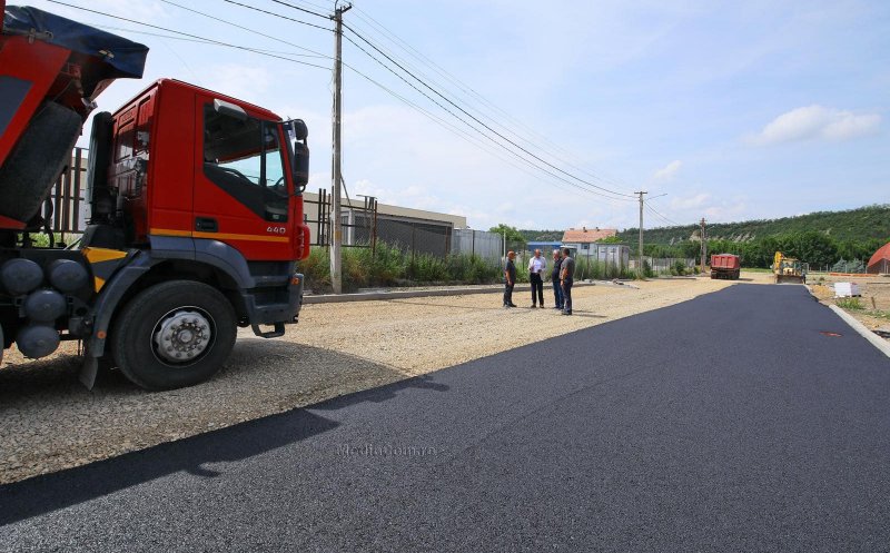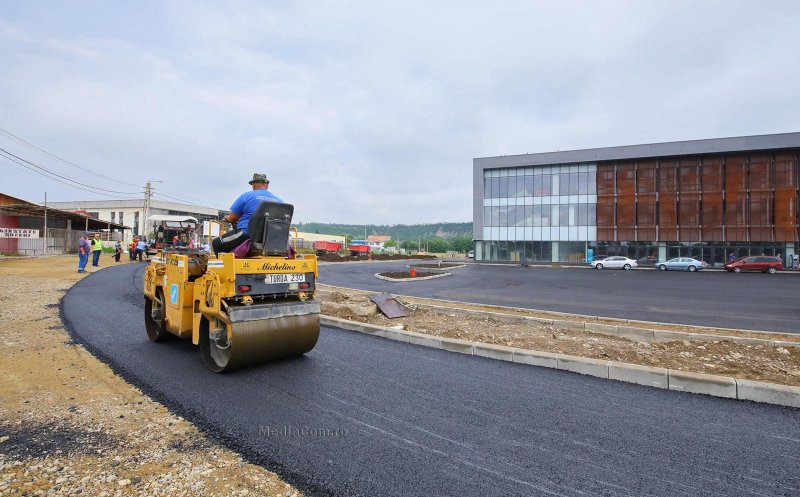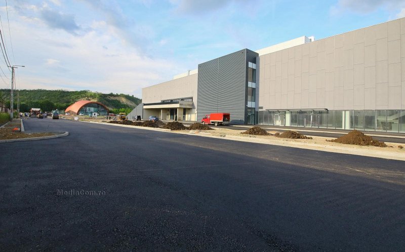 După ce s-a montat suprafața de joc la interior, în acest moment s-a trecut deja la amenajarea zonei adiacente săli. S-a asfaltat parcarea, iar acum a început și asfaltarea drumului.