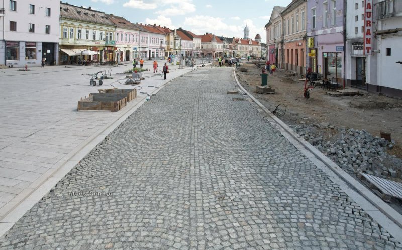 Potrivit edilului Cristian Matei, lucrările se concentrează momentan atât pe partea carosabilă, care este pavată cu piatră cubică, cât și pe zona pietonală, unde sunt montate dale de granit.