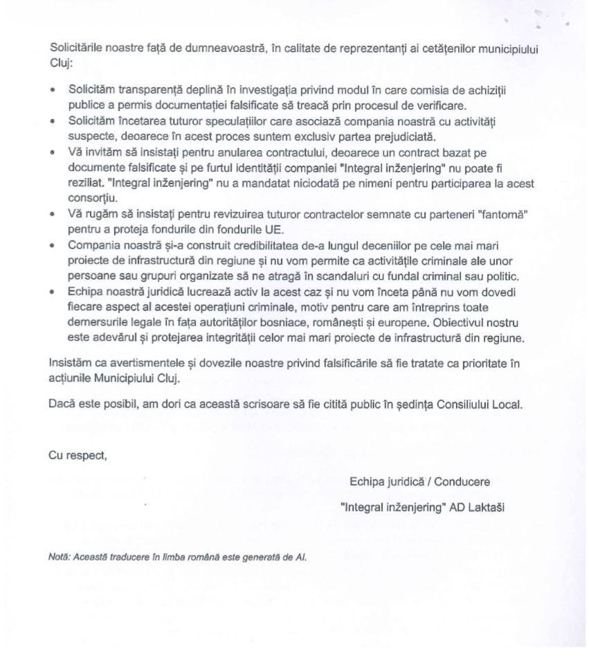 „Integral inženjering” AD Laktaši", se arată în comunicatul remis Consiliului Local, în scrisoarea înregistrată la Primăria Cluj-Napoca în 12 februarie 2026.