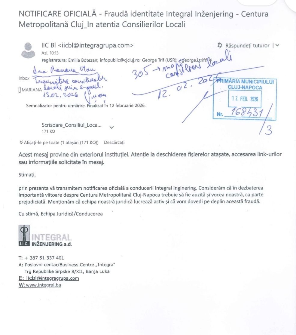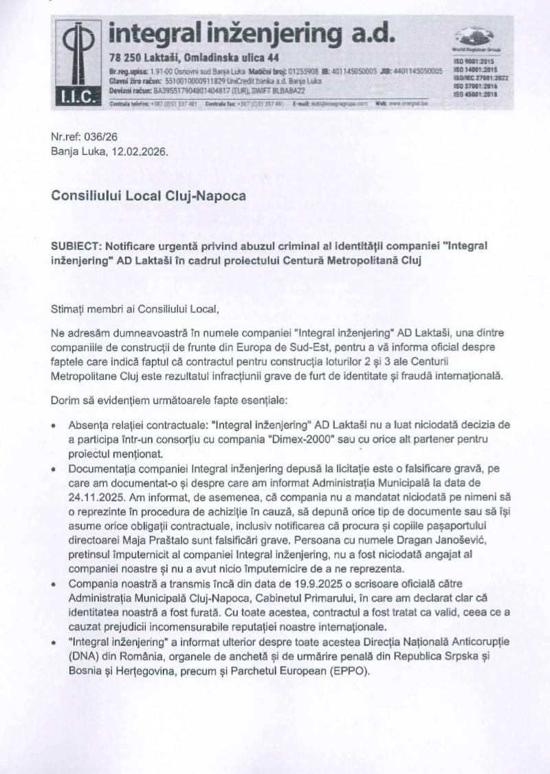 Compania bosniacă Integral Inženjering a transmis o notificare oficială consilierilor locali din Cluj-Napoca înaintea ședinței care urmează să aibă loc luni, 16 februarie 2026, document în care susține că nu au participat niciodată la un consorțiu pentru proiectul Centurii Metropolitane și că documentele depuse în licitație în numele companiei ar fi falsificate.