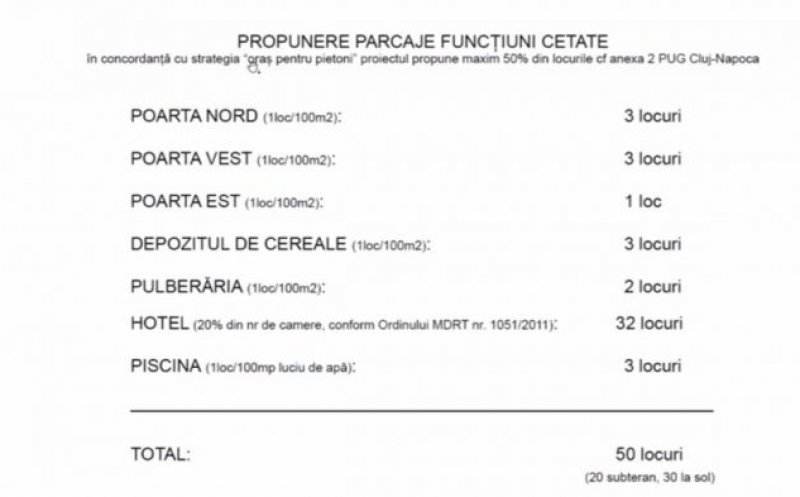 Pe platoul cetăţii se propune o zănă pietonală, unde să fie instalate terase, să aibă loc funcţiuni culturale, evenimente temporare. Aici va fi instalată o staţie pentru autobuzele electrice şi o parcare de biciclete. Parcarea auto din spatele Hotelului Belvedere va fi defiinţată. "Având în vedere că propunem zone pietonale şi suntem în strategia oraş pentru pietoni, propunem totuşi satisfacerea a 50% din propunerea făcută în PUG-ul încă în vigoare, dar pentru zonele nepietonale. La Hotel, am permis totuşi puţin de 50%, 32 de locuri".