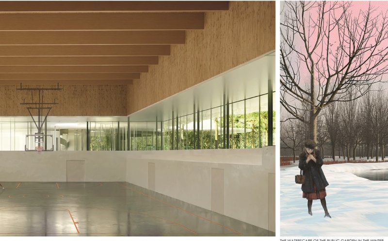 Programul construit nu este întins pe tot parcul, ci a fost concentrat în colțul sudic, lăsând majoritatea spațiului deschis pentru evenimente spontane și utilizare temporară — individuală sau colectivă. Toate construcțiile au fost grupate într-o singură clădire. Dat fiind că pavilioanele din parcuri se luptă deseori să atragă suficienți vizitatori și să păstreze o ambianță vie, concentrarea funcțiunilor în aceeași clădire este o alegere pertinentă care va facilita interacțiunea socială optimă între diferiții utilizatori ai parcului. Structurile în sine fac aluzie la arhitecturi contemporane apreciate. Ele sunt deopotrivă exemple de subtilitate și discreție a intervenției, și o arhitectură care mizează pe calități spațiale ale „intermediarului” — interior-exterior, lumină-umbră, acoperit-deschis etc. Materialele indică structuri ușoare neinvazive, forme simple care, prin articulare liberă, devin elemente de mediere între oraș și parc. Fațadele de sticlă ale parterului stabilesc o relație vizuală puternică între interior și exterior, permițând activităților să anime spațiul public din jur, iar atmosfera naturală să pătrundă în interior.