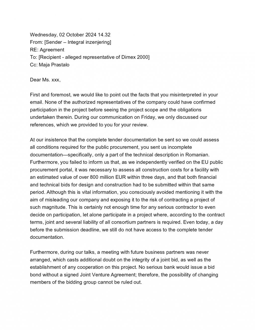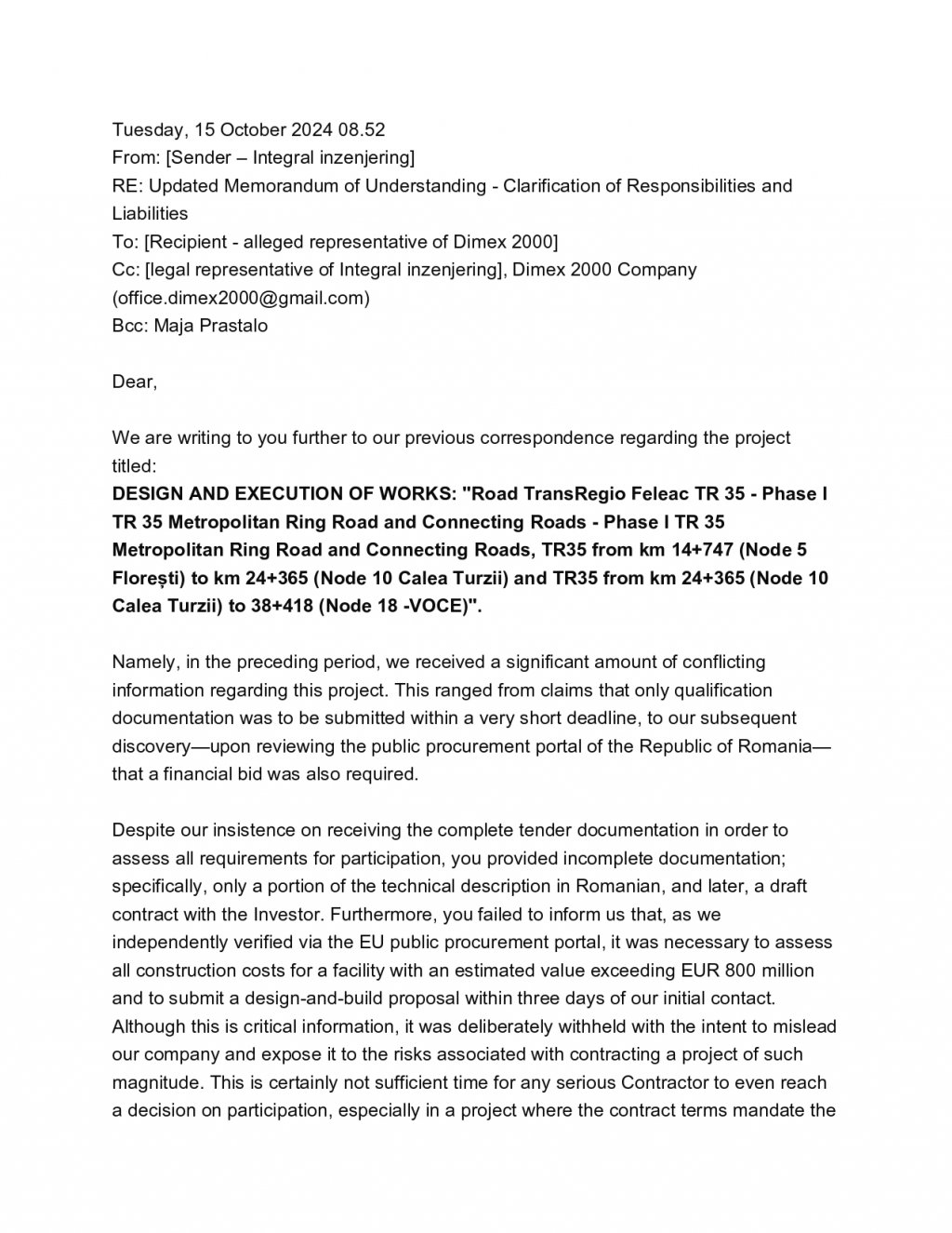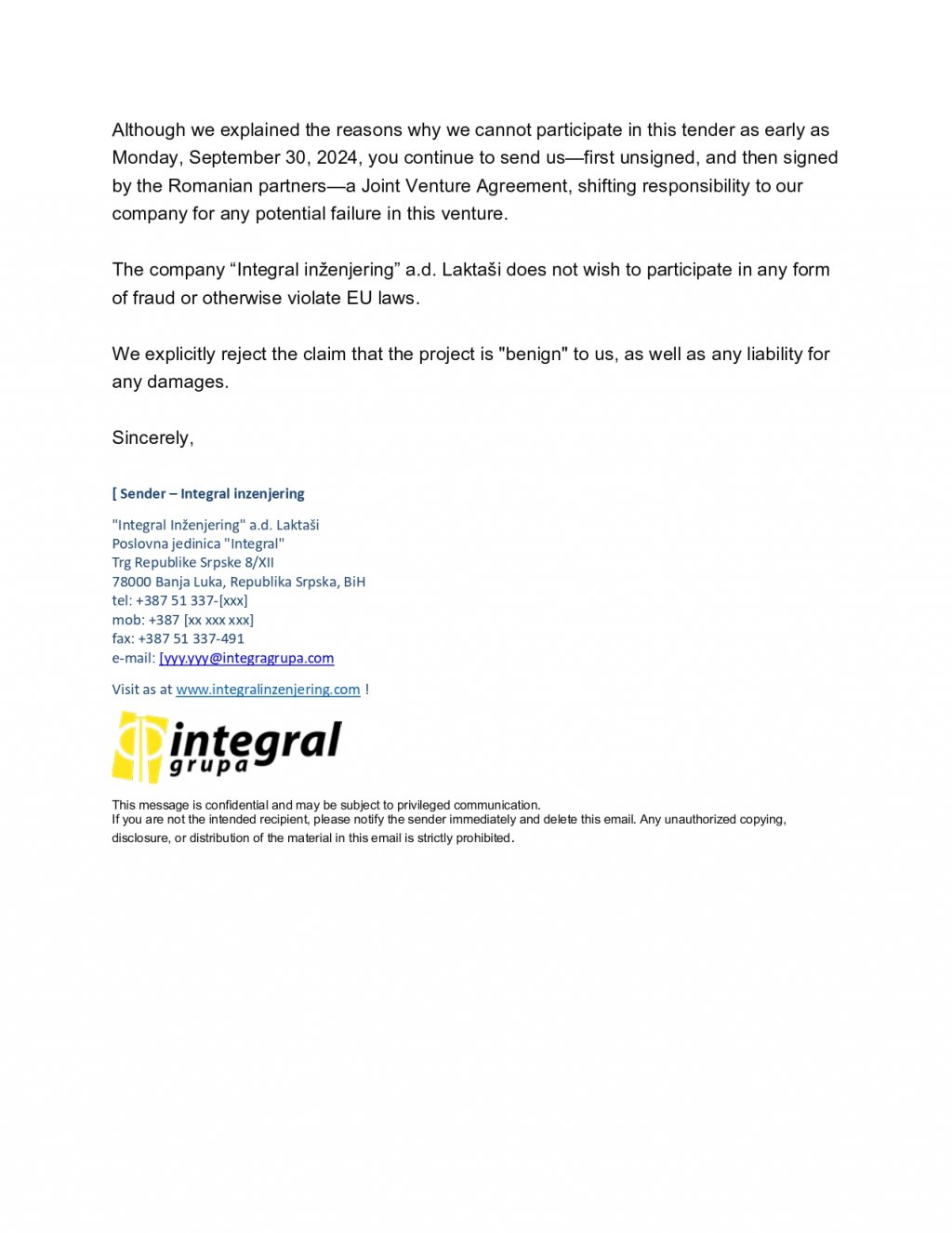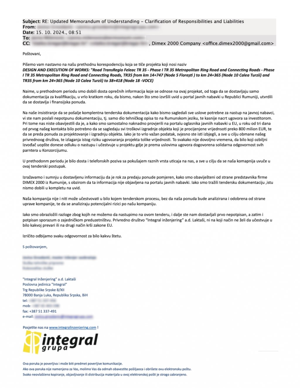 "Reprezentanții Integral Inženjering explică motivele refuzului din 02.10.2024, cu o zi înainte de termenul limită de depunere. Cei de la Dimex nu le-au dat documentația completă, dar în schimb le-au cerut un termen total nerealist ca să oferteze: 3 zile. Bosniacii scriu clar că există risc de inducere în eroare. atât timp cât românii fac presiuni să semneze documentația retroactiv, nu doresc să participe în niciun fel de fraudă ori ilegalități pe legislație europeană și resping orice răspundere pentru eventuale daune.