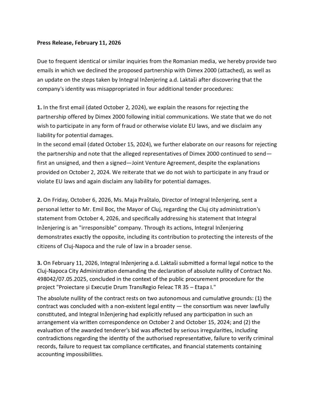 Asociația Pro Infrastructura a intrat un posesia unor documente trimise de Integral, care ar demonstra că refuzul de a se asocia a fost transmis negru pe alb către Dimex în 02.10.2024, cu o zi înainte de depunerea ofertei la licitația Centurii Metropolitane Cluj-Napoca, ba chiar compania bosniacă a revenit în 15.10.2024 cu repetarea refuzului.