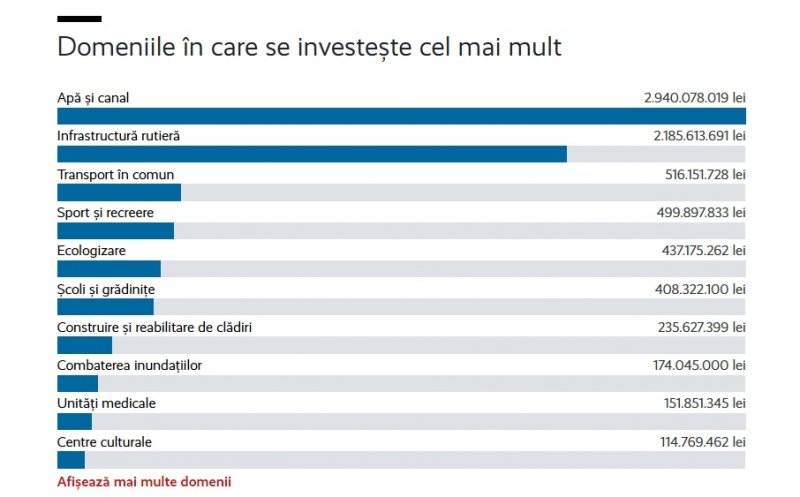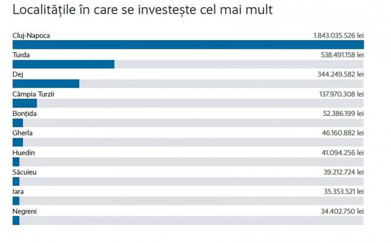 Din cele 7.8 miliarde de lei, 6.4 provin din fonduri europene şi doar 452 de milioane de lei din fonduri locale. Cei mai mulţi bani merg spre apă şi canal, infrastructură, transport în comun şi sport. Oraşele sunt în top la sumele investite: Cluj-Napoca, Turda, Dej, Câmpia Turzii, urmate de localitatea Bonţida.