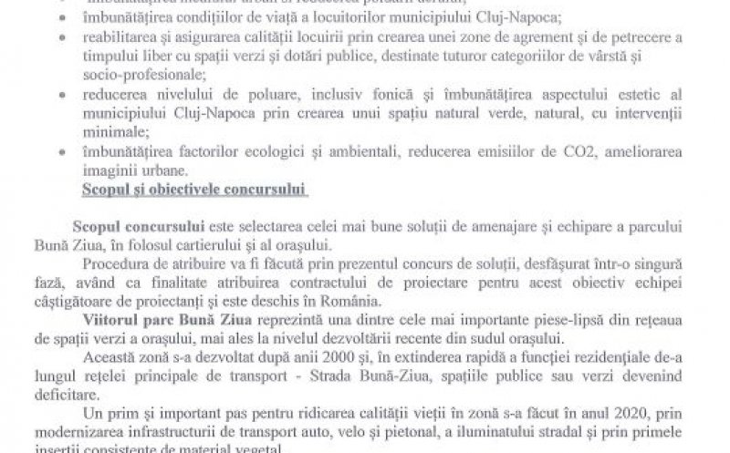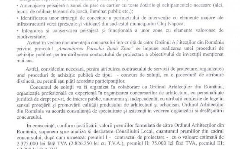 Consiliul local va aproba concursul de soluții pentru amenajarea Parcului Bună Ziua, cuantumul premiilor oferite fiind: locul I – 2,3 milioane de lei, locul al II-lea – 75.000 lei, locul al III-lea, 50.000 lei. Concursul se va finaliza prin negociere, fără publicarea prealabilă a unui anunț de participare.