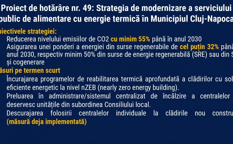 "Am votat, în ședința de Consiliu Local, aprobarea Strategiei locale a serviciului de alimentare cu energie termică a consumatorilor din Municipiul Cluj-Napoca în perioada 2022-2030 și perspectivă 2050. O preocupare majoră la nivelul municipalității o reprezintă eficientizarea funcționării sistemului de producere şi transport a energiei termice, iar acest demers presupune realizarea de lucrări de investiții, mai exact de modernizare a echipamentelor și a rețelelor existente.
