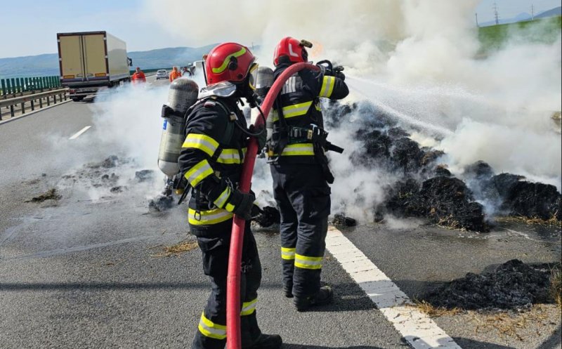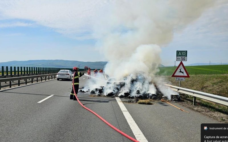 Un incendiu puternic a izbucnit, miercuri, la un autocamion care transporta baloți de lucernă, pe autostrada A10, pe sensul de mers dinspre Turda (județul Cluj) spre Sebeș (județul Alba).