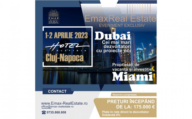 Emax Real Estate, în parteneriat cu cei mai mari dezvoltatori din Dubai şi Miami organizează, în perioada 01-02 aprilie 2023, la Hotel Platinia, Cluj-Napoca unul dintre cele mai mari evenimente din România dedicat vânzării de imobiliare în Dubai și în Miami!