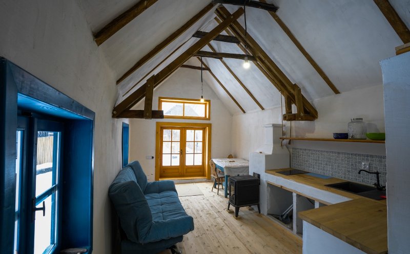 Acoperișul este din șindrilă, realizat și bătut de un meșter priceput din Vrancea. Casa și anexa au o suprafață totală de 60 mp. Casa regăsește 2 camere, iar în anexă se află zona de living bucataria si baia.