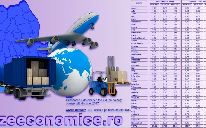 24 de județe au înregistrat anul trecut excedent comercial în 2017, deși acesta este în scădere față de anul anterior. Argeșul are +1,39 miliarde de euro, pe doi se află Alba, cu +1,05 miliarde, pe trei, Timiș (+0,9 miliarde), urmate de Olt și Sibiu, cu câte +0,6 miliarde.