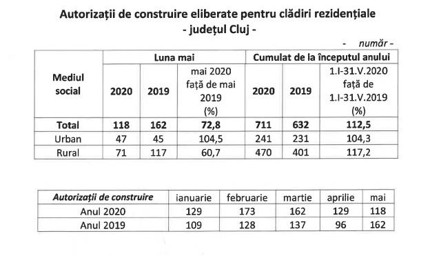 În mai 2020, la nivelul judeţului Cluj, au fost eliberate 118 autorizaţii de construire pentru clădiri rezidenţiale (cele mai multe în zona rurală), cu 11 mai puţin decât în luna anterioară şi cu 44 mai puţine faţă de aceeaşi lună a anului precedent, arată datele Direcţiei Judeţene de Statistică.