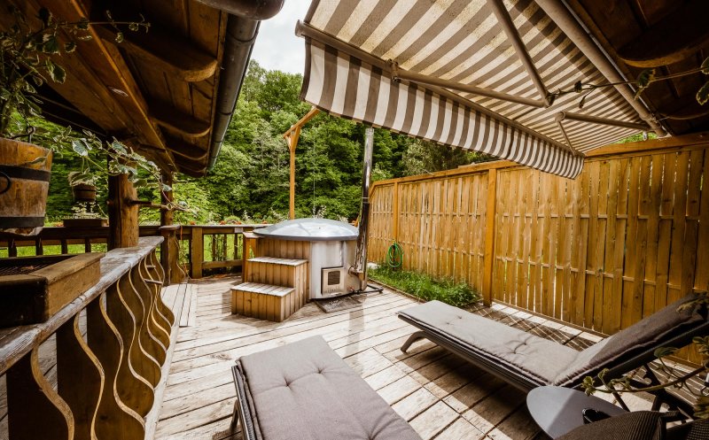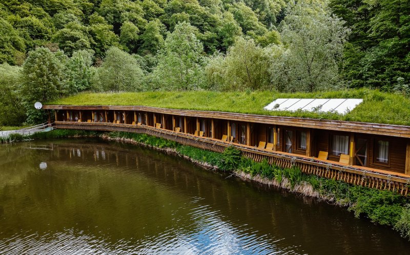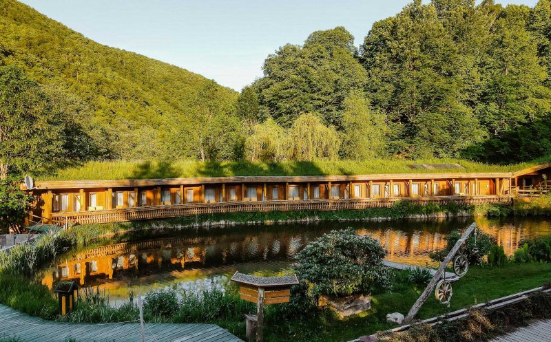 "O pensiune toată bătută în piatră, lemn și flori roșii își întâmpină oaspeții cu camere moderne și terase boeme pentru cafele și pierdut privirea-n verde. Totul e din lemn, interior și exterior. Arhitectura se încadrează în stilul rustic local, dar interiorul camerelor îmbrăcate în lemn are atmosfera de cabană contemporană. Sunt 10 camere cu balcoane deasupra lacului, alte 7 camere în corpul principal (două dintre ele au terasă proprie și ciubăr privat cu aeromasaj) și 4 apartamente (unul cu suprafață de 48mp, duș și cadă cu hidromasaj; terasa acestuia este deasupra cascadei; alte două apartamente au ciubăr privat).