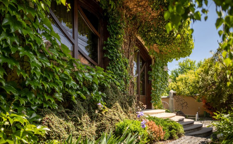 ''S-a dorit a fi o evadare din aglomerația urbană, o oază de liniște aflată la 5 min de Centrul Clujului, in cartierul Andrei Muresanu. Încă de la intrare suntem atrași de gardul din fier forjat prelucrat manual după o tehnică medievală, compus din frunze și elemente organice stilizate care se incolăcesc în jurul stâlpilor din praf de piatră. Aleile sunt din piatră cubică de granit datând din perioada interbelică care împânzesc curtea. Gradina, cu alei șerpuite are o vegetație luxuriantă aflată la maturitate. Soclul casei este sculptat manual și finisat cu praf de piatră care ne duc cu gândul la rădăcini de mangrove.