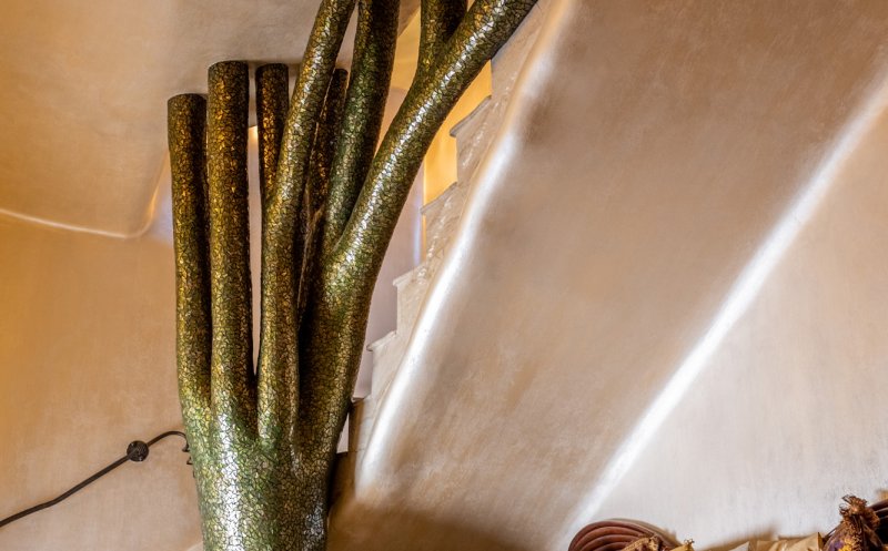 Imobilul are 3 intrări, 2 in față și una în spatele casei. Ușa de la intrare, la fel ca tâmplăria din întreaga locuință, este din lemn Larice siberian și vitralii. Vitraliile care se regăsesc in întreaga locuință sunt realizate manual în tehnica Tiffany. În holul de la intrare ne întâmpină tavanul in forma de vortex. La etajul 1 se află 2 dormitoare, 2 băi și un dressing. 4 uși cu vitralii tematice -fiecare încăpere reprezinta un anotimp. În hol se găsește un copac stilizat care ține si loc de balustradă format din 70.000 bucăți de mozaic Bisazza tăiate, lipite si potrivite manual, cu frunzele căzute în pardoseala de marmură.