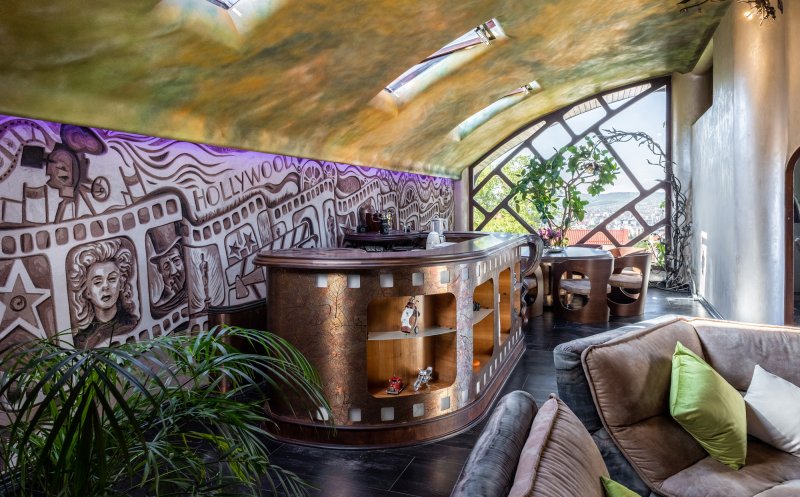 Mansarda este un open space compus din trei zone funcțional distincte delimitate de un stâlp central decorat în stil Art nouveau care are la bază un tablou rotund din mozaic placat cu aur de 24 karate lucrat manual, care susține tavanul pictat manual in stil Art nouveau in culori pastelate. Tot la mansardă pe peretele din spatele barului regăsim o opera de artă realizată prin tehnica sgraffito, o tehnică de peste 200 de ani, in 7 straturi de tencuială de nuanțe diferite.