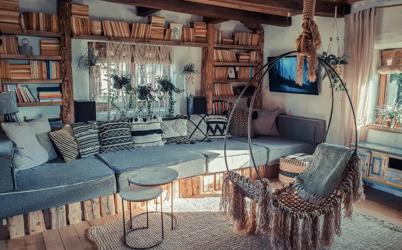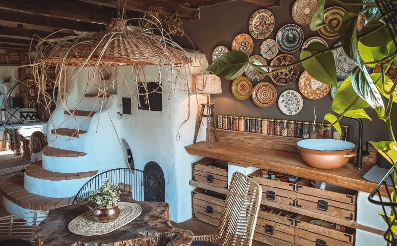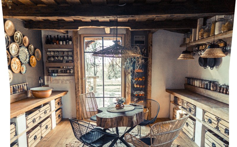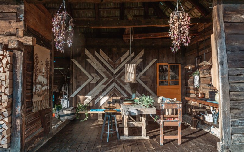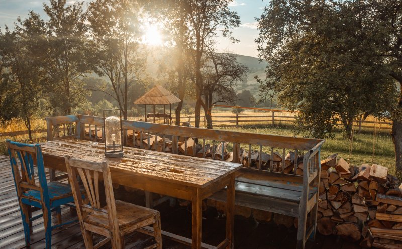 Prispa transformată în loc de odihnă contopeste spațiul interior cu cel exterior, fiind spațiul ideal pentru a te odihni în mijlocul naturii, iar colecția de farfurii și obiecte ceramice îti dau întâlnire cu cele două mari stiluri ceramice românești: Horezu și Corun.