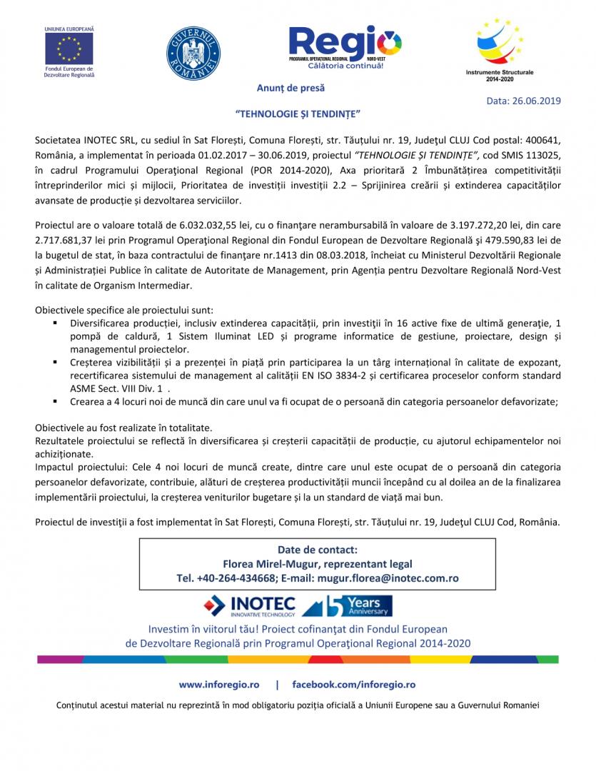 Societatea INOTEC SRL, cu sediul în Sat Florești, Comuna Florești, str. Tăuțului nr. 19, Judeţul CLUJ Cod postal: 400641, România, a implementat în perioada 01.02.2017 – 30.06.2019, proiectul “TEHNOLOGIE ȘI TENDINȚE”, cod SMIS 113025, în cadrul Programului Operaţional Regional (POR 2014-2020), Axa prioritară 2 Îmbunătățirea competitivității întreprinderilor mici și mijlocii, Prioritatea de investiții investiții 2.2 – Sprijinirea creării și extinderea capacităților avansate de producție și dezvoltarea serviciilor.
