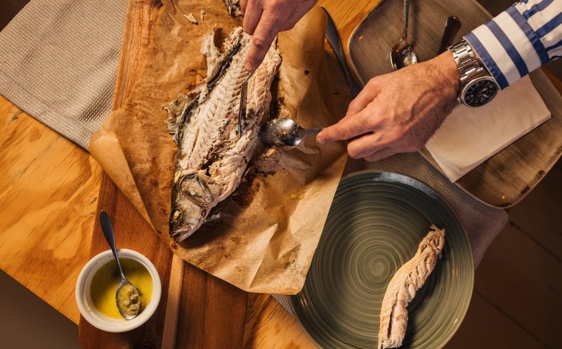 Chef Gabriel Macavei: Sunt din ce în ce mai căutate aceste produse. Din păcate, noi fiind poziționați în centru țării, avem mai greu acces la produse deosebite din această categorie care ajung la noi în țară. Folosim păstrăvul, care este local, se găsește în râuri și păstrăvării destul de apropiate de noi. Bibanul îl primim proaspăt din afara țării, de asemenea și somonul. Fructele de mare mai puțin, însă gama mai sofisticătă la noi este pe carne și legume, deoarece nu suntem nișați pe preparate din pește sau fructe de mare.