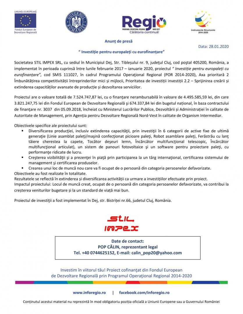 Societatea STIL IMPEX SRL, cu sediul în Municipiul Dej, Str. Tibleșului nr. 9, judeţul Cluj, a implementat proiectul “ Investiție pentru europaleți cu eurofinanțare”, cod SMIS 111027, în cadrul Programului Operaţional Regional (POR 2014-2020),