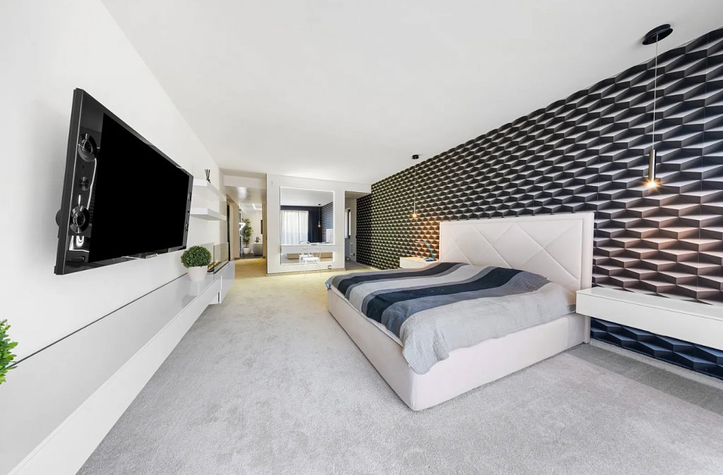 Etajul este dedicat zonei de noapte: un dormitor matrimonial cu dressing, baie proprie și balcon, două dormitoare secundare luminoase, fiecare cu priveliște panoramică, și o baie elegantă. Subsolul transformă casă într-un spațiu de relaxare complet: cinematograf privat cu proiector laser short-range și sistem audio Dolby Atmos de 8000W, camera de hobby, saună, baie, dressing și camera tehnică.
