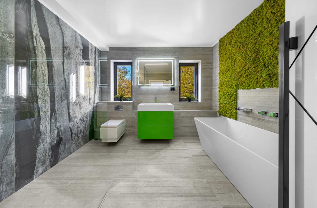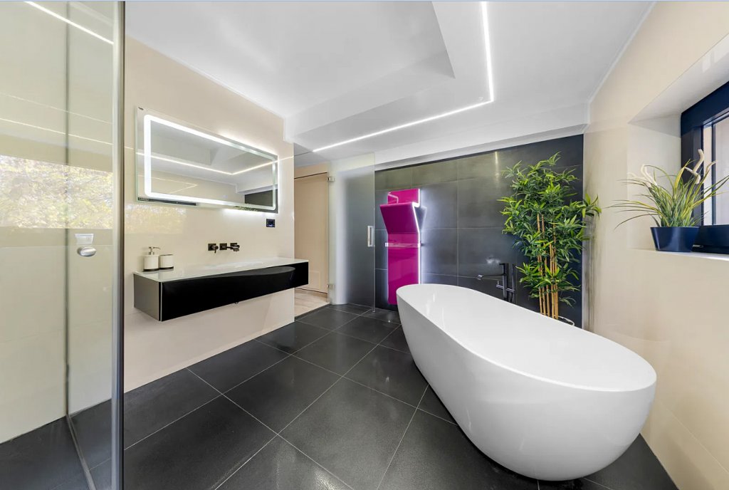 Construită pe un teren în pantă, proprietatea impresionează și prin soluțiile tehnice: foraje de stabilizare adânci de 30 m, pereți din cărămidă de 30 cm izolați cu polistiren de 15 cm, pardoseli epoxidice, mochetă în dormitoare și gresie în băi. Caloriferele custom-made iluminate și finisajele minimaliste completează designul contemporan.