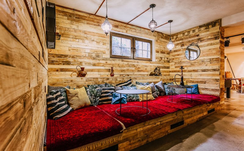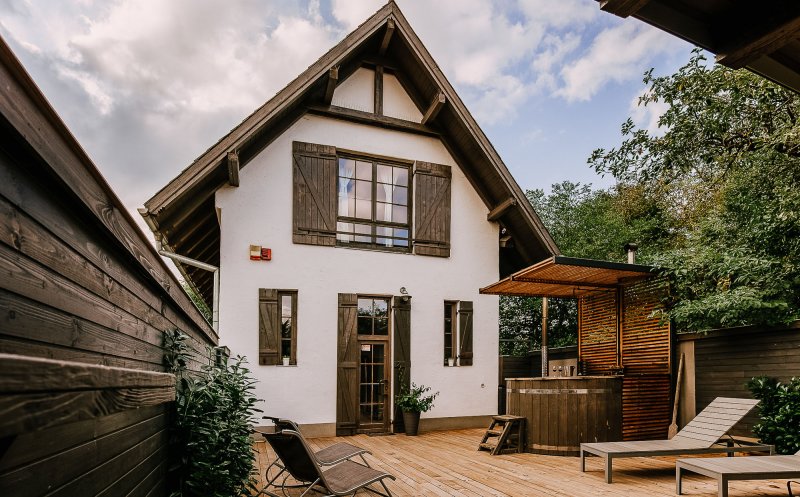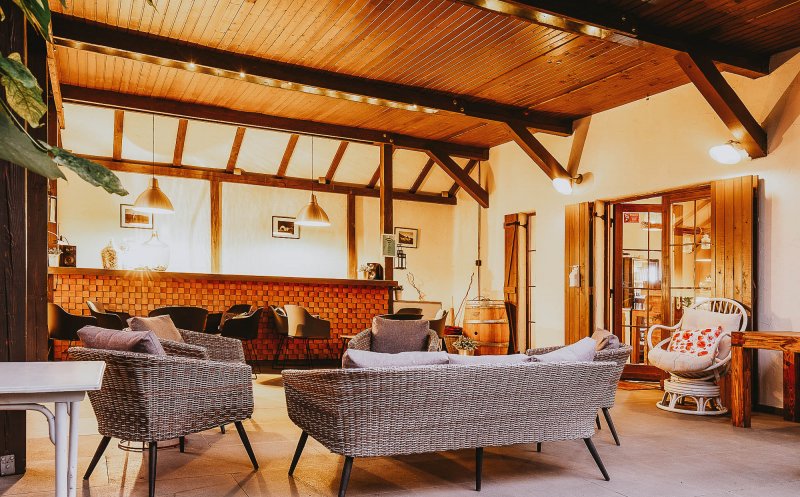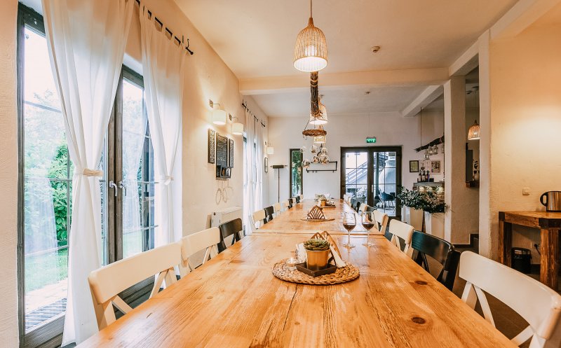 Sunt patru camere cu băi proprii și acces direct în grădina la parter și alte patru camere la etaj. Cele două apartamente cu câte două camere au șemineu, balcon și chicineta. Zona de lucru este situată la etaj - birou și sala conferințe utilată cu smart TV, flipchart, whiteboard și aer condiționat pentru 20 de persoane cu posibilități de extindere.La parter sunt bucătăria și restaurantul cu masă comună lungă. Mesele pot fi însă aranjate și pentru grupuri mici, dacă evenimentul o cere.