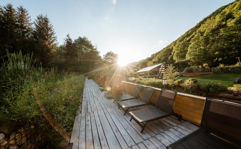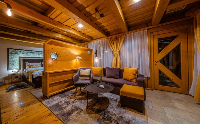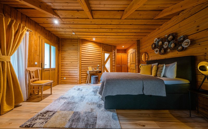 Totul e din lemn, interior și exterior. Arhitectura se încadrează în stilul rustic local, dar interiorul camerelor îmbrăcate în lemn are atmosfera de cabană contemporană. Lemnul reflectă lumina creând un cocon molcom, blând și cald. Accesoriile de iluminat și piesele de mobilier contemporan coordonate cromatic fac o combinație modernă gri-galben-negru.