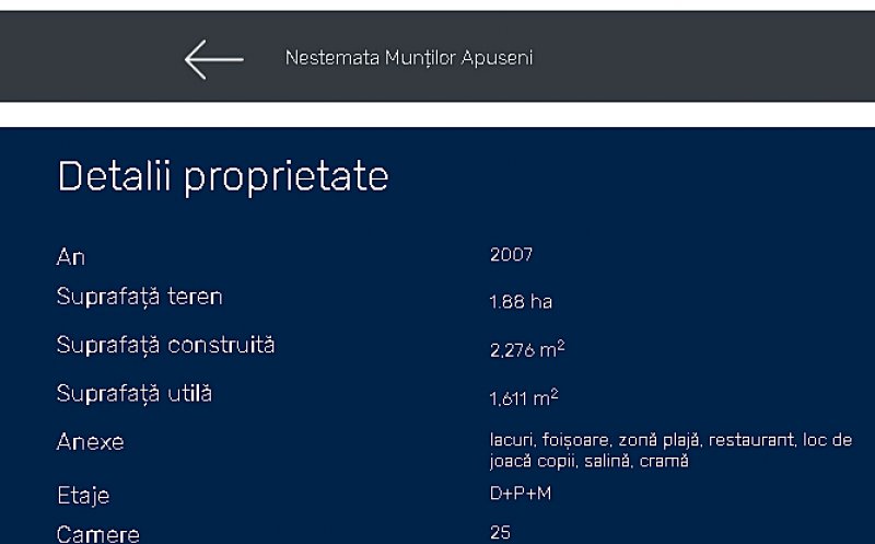 "La numai 45 km de Cluj, la răscrucea apelor din Valea Ierii și Valea Negrii un drum prin pădure se deschide brusc în ceea ce amintește de o dumbravă minunată, un luminiș inundat de verdeață în jurul unui ochi de apă. O pensiune toată bătută în piatră, lemn și flori roșii își întâmpină oaspeții cu camere moderne și terase boeme pentru cafele și pierdut privirea-n verde. Aerul de munte se simte rece și tare când intră în nări, ajunge în vene și ozonează", se arată în descrierea proprietăţii de pe pe site-ul Sotheby’s România, unde este listată aceasta.