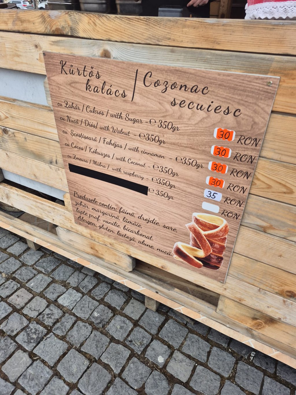 De la căsuțele de la târguri nu lipsește nici kürtőskalács-ul. Acesta are prețuri între 30 - 35 lei.