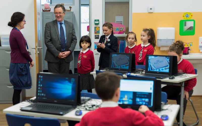 Un grup de elevi format din ambasadorii Royal School l-a primit pe Andrew Noble, care a făcut un tur al şcolii alături de copii. Ambasadorul s-a oprit la fiecare clasă. Nu au lipsit provocările deja „obișnuite” pentru fiecare oaspete de seamă al şcolii, astfel că diplomatul a fost invitat să tragă la poarta de fotbal din hol.