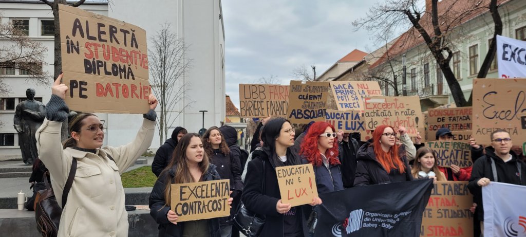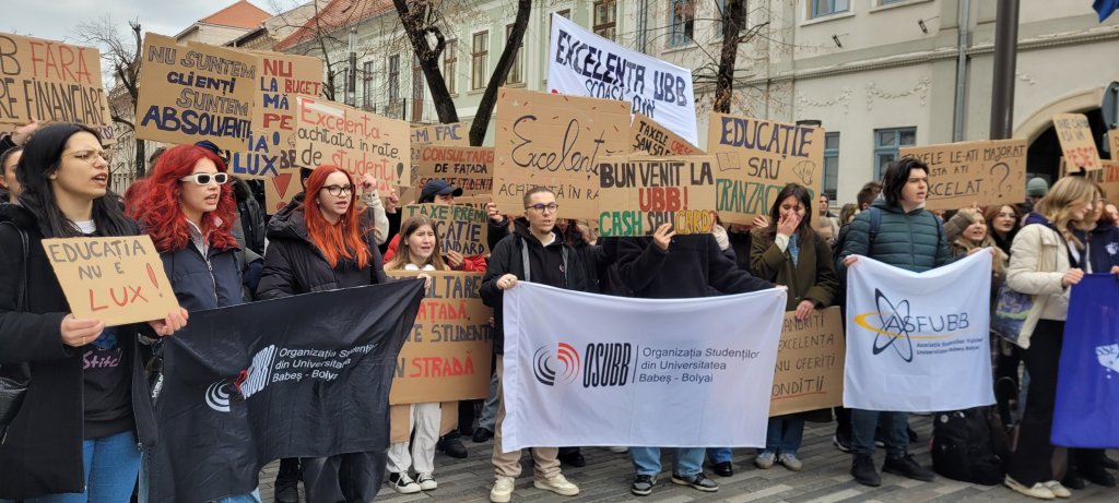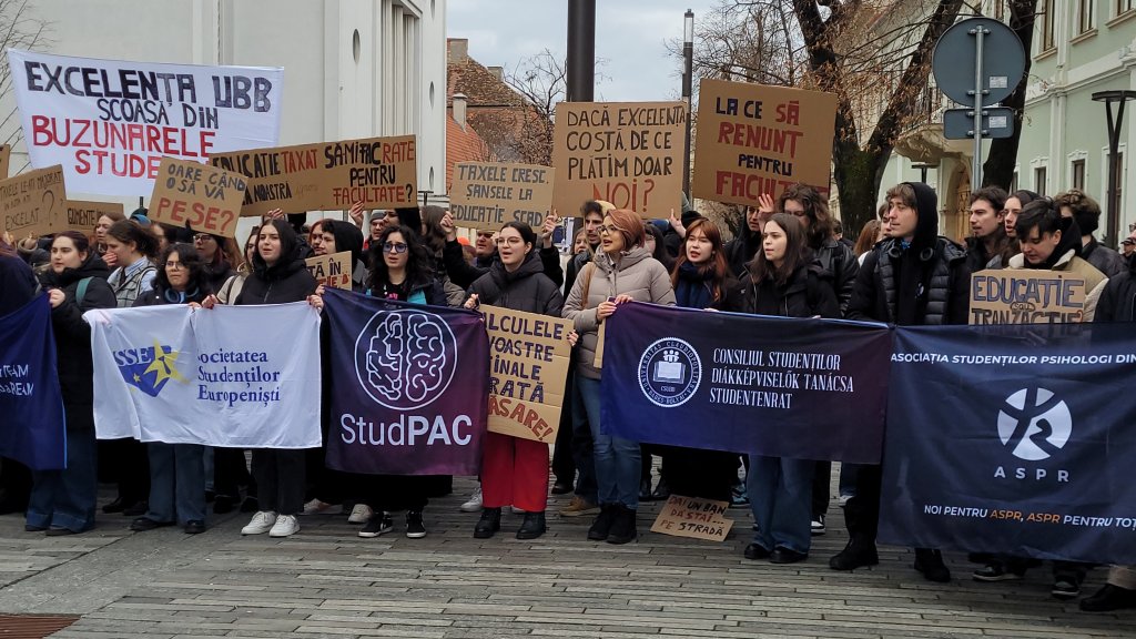 Studenții UBB au ieșit în stradă, miercuri, pentru a-și arăta nemulțumirea față de recentele majorări ale taxelor universitare, precum și pentru suplimentarea fondului de burse.