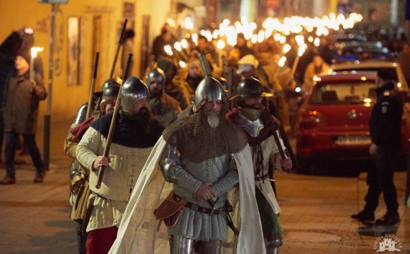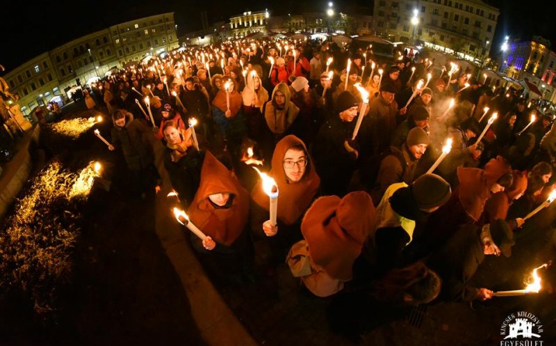 Sute de persoane cu torţe aprinse în mâini şi având în frunte bărbaţi îmbrăcaţi în ţinute medievale din secolul XV au participat, sâmbătă seara, la un marş solemn pentru aniversarea a 576 de ani de la naşterea regelui Ungariei, Matia Corvin, născut la Cluj-Napoca.