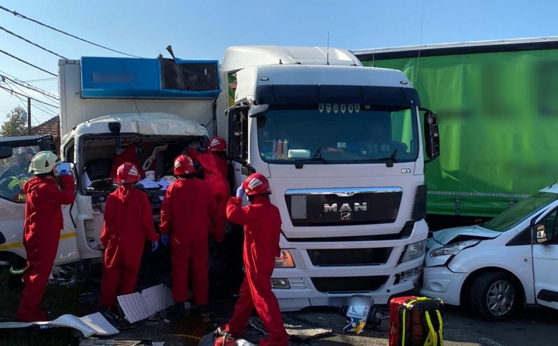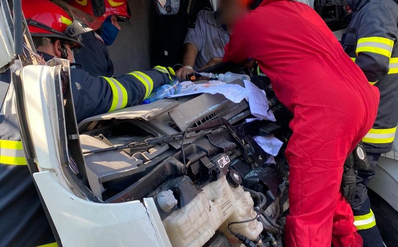 UPDATE: Intervenția pentru descarcerarea bărbatului din cabina camionului a fost una extrem de dificilă, după cca. o oră, timp în care bărbatul a primit asistență medicală de urgență (a primit lichide și sedative intravenos, i s-a pus guler cervical, iar medicii au comunicat cu el în cea mai mare parte a timpului cât au durat stabilizarea autovehiculului, asigurarea accesului către victimă, decopertarea plafonului cabinei, îndepărtarea bordului care s-a deformat peste picioarele bărbatului și extragerea lui cu echipamentele speciale pentru a evita agravarea leziunilor suferite.