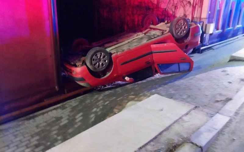 Foto Accident în Dej! Mașină cu roțile în sus, într-un gard
