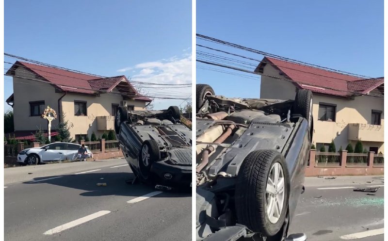 În accident au fost implicate două autoturisme dintre care una s-a răsturnat chiar în mijlocul drumului.