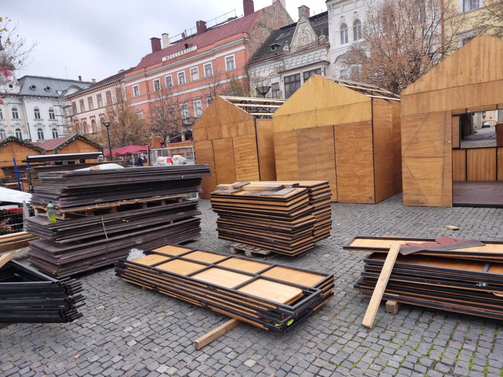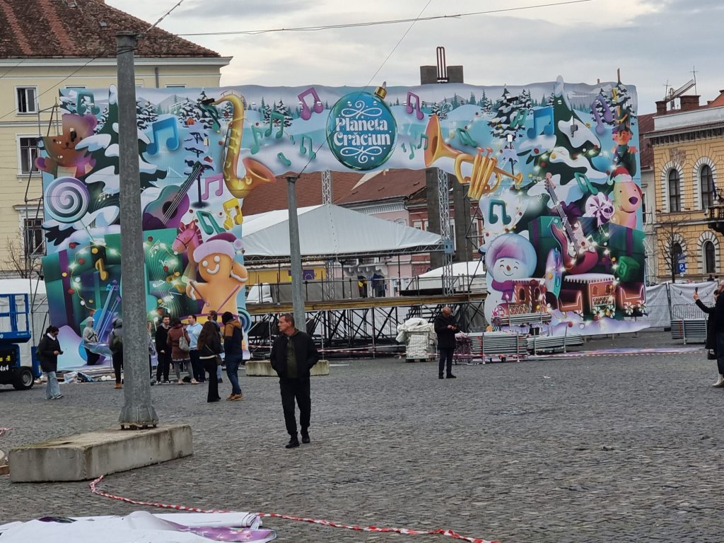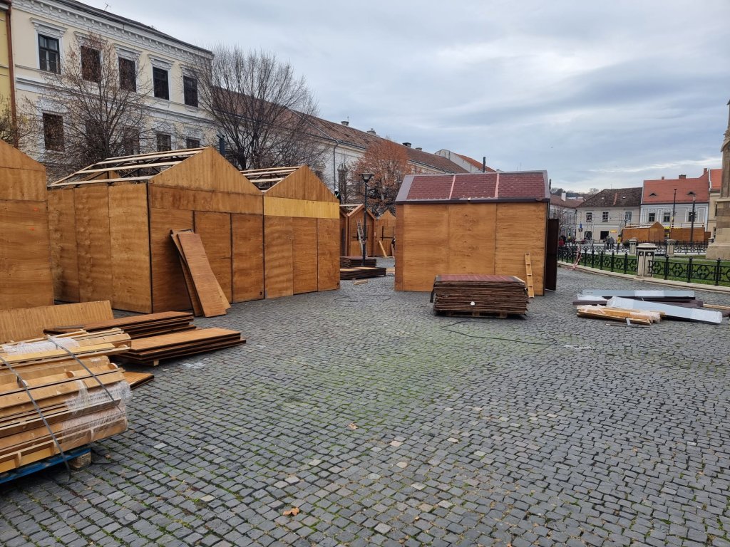 Au rămas mai puțin de două săptămâni până când Târgul de Crăciun își va deschide porțile, iar pregătirile sunt deja în toi. Muncitorii instalează căsuțele de lemn, o parte din luminițele festive au fost deja montate, iar scena începe să prindă contur.