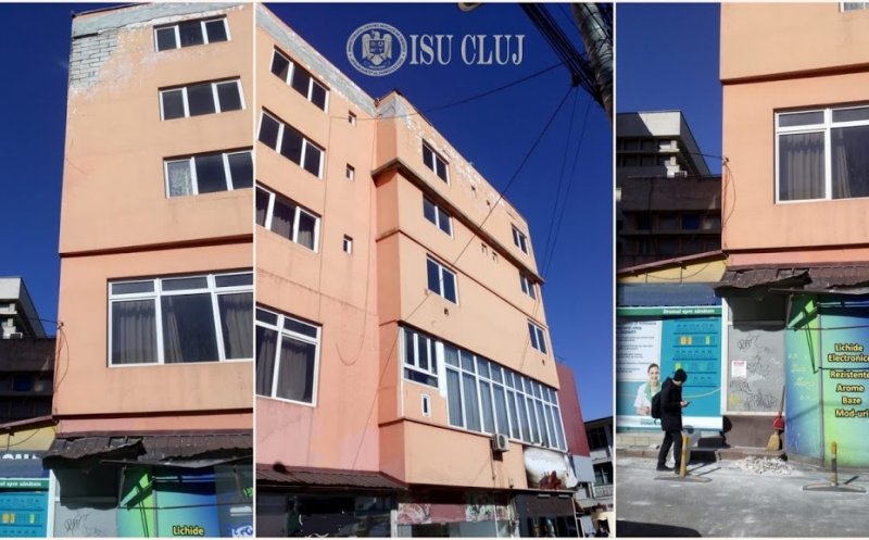 Pompierii clujeni au operat cu autospeciala pentru intervenții la înălțimi, pentru a înlătura bucăți de tencuială instabile de pe laterala unui bloc situat pe strada Argeș, ce funcționa în trecut ca hotel. În cădere, acestea au distrus copertina de tablă, de la intrarea unui magazin.