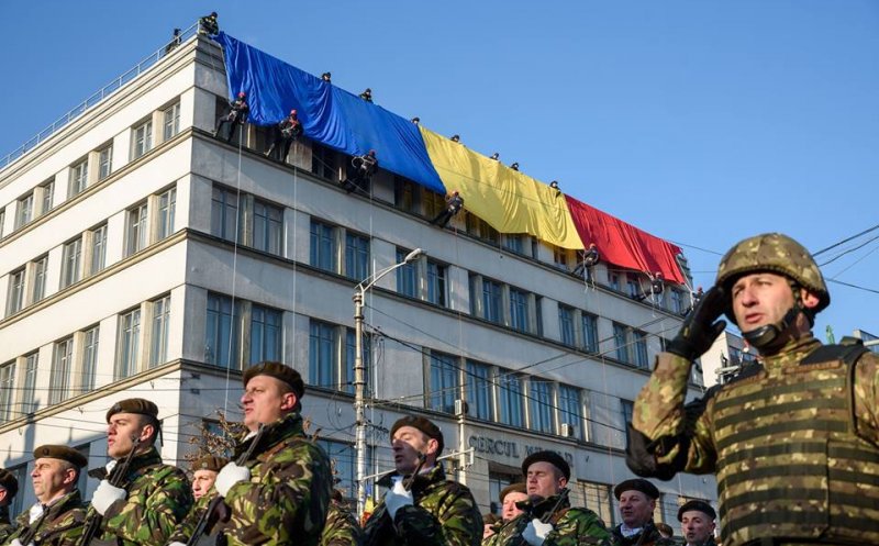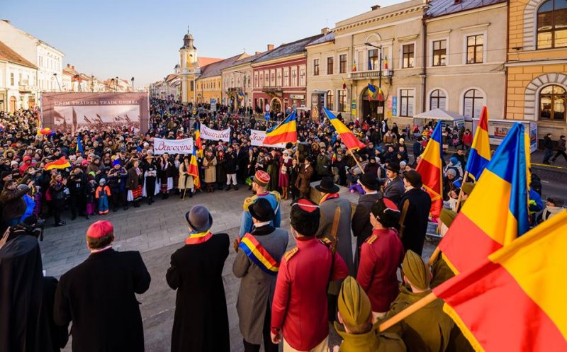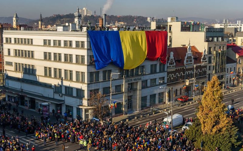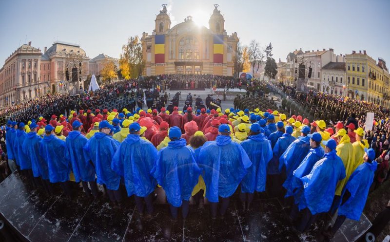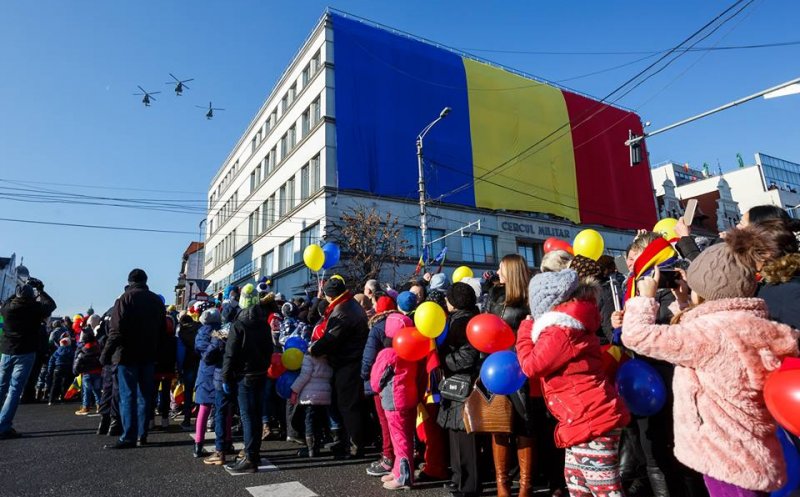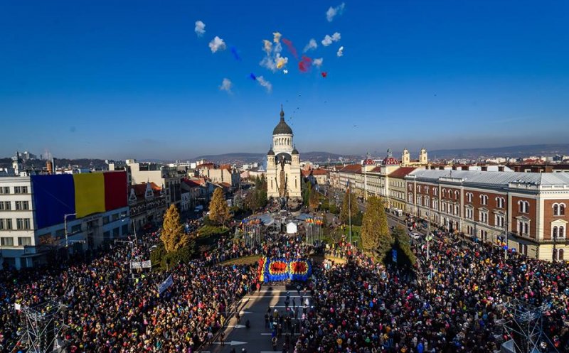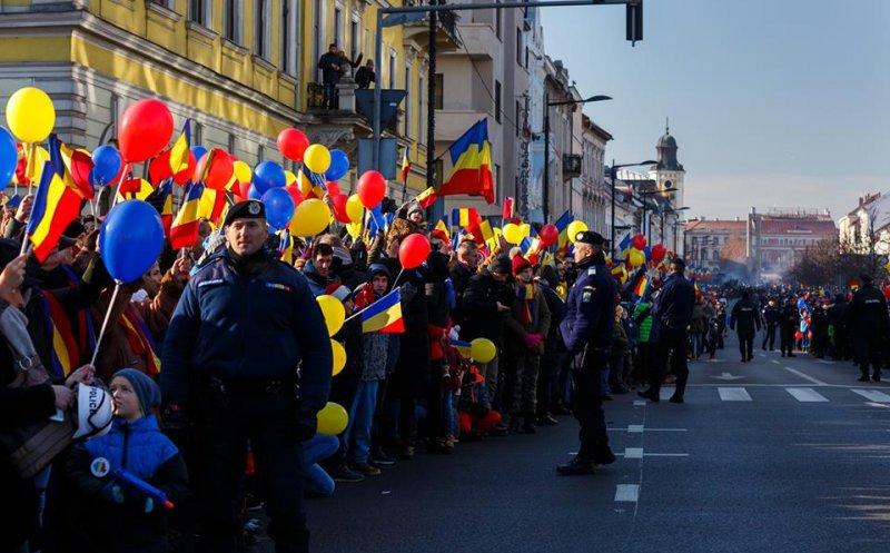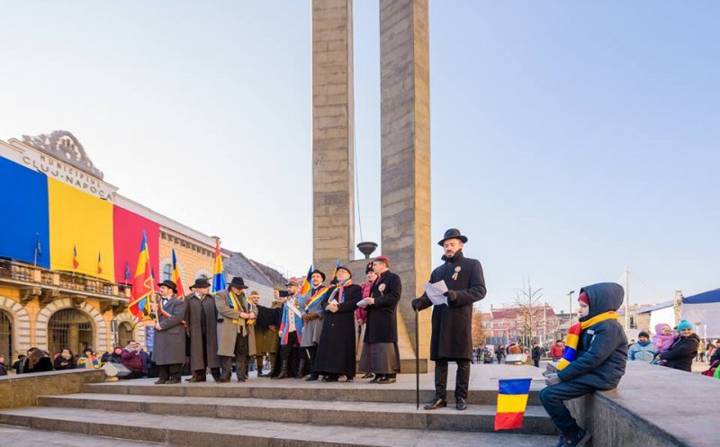 Manifestările dedicate Zilei Naţionale a României au început cu depunerea de coroane de flori la statuia lui Mihai Viteazu, în premieră în Cluj-Napoca şi au continuat cu padara militară în Piaţa Avram Iancu. La intonarea Imnului Naţional, alpiniştii militari au desfăşurat un tricolor uriaş pe clădirea Cercului Militar.