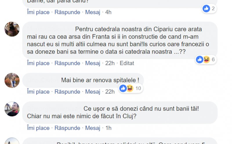 Sute de cititori au reacționat la știrea postată de ZIUA de CLUJ miercuri, 17 aprilie 2019, despre decizia luată în ședința de consiliu județean, de a dona aproape 21.000 de euro (100.000 de lei) pentru reconstruirea catedralei din Paris, distrusă parțial de un incendiu grav.