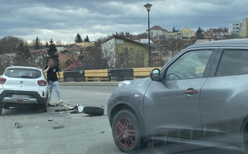 Mașinile s-au izbit una de alta pe podul care traversează liniile ferate, lângă Gara Cluj-Napoca. O Dacia Spring, una dintre mașinile implicate în accident, a rămas fără o roată în urma impactului.