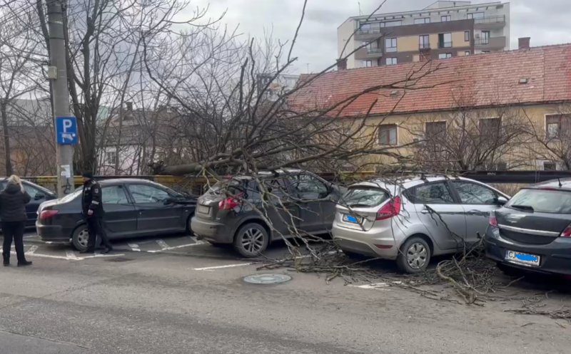 Un copac a căzut peste trei autoturisme parcate pe strada Iașilor din municipiul Cluj-Napoca.