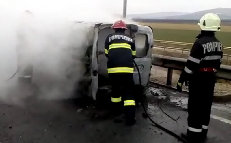 Pompierii clujeni au intervenit, vineri, pentru a stinge flăcările care au cuprins o autoutilitară, pe autostrada A10, în apropiere de Turda.