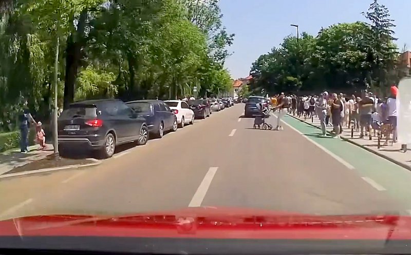 Un gest de inconştienţă din partea unei mame a fost surprins de camera de bord a unui participant la traficul din Cluj-Napoca joi, 1 iunie, lângă Parcul Central, unde au avut loc mai multe activităţi de Ziua Copilului.