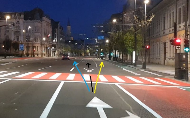 Dar dacă mergem înainte și abia apoi dreapta ca să viram pe Str. Cuza Vodă, mai este valabil intermitentul galben la dreapta? Noi nu facem dreapta, mergem înainte. Dreapta înseamnă să virăm pe Str. Constanța.