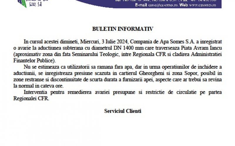 „În cursul acestei dimineți, miercuri, 3 iulie 2024, Compania de Apă Someș S.A. a înregistrat o avarie la aducțiunea subterană cu diametrul DN 1400 mm care traversează Piața Avram Iancu (aproximativ zona din fața Seminarului Teologic, între Regionala CFR și clădirea Administrației Finanțelor Publice)”, a transmis Compania de Apa.