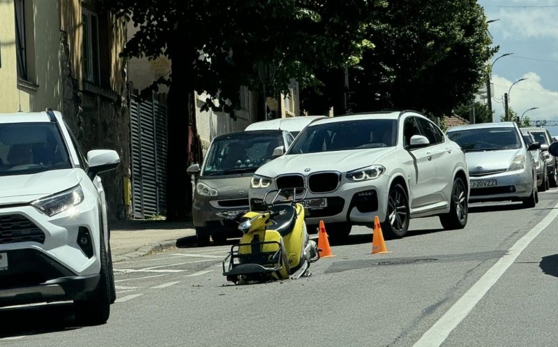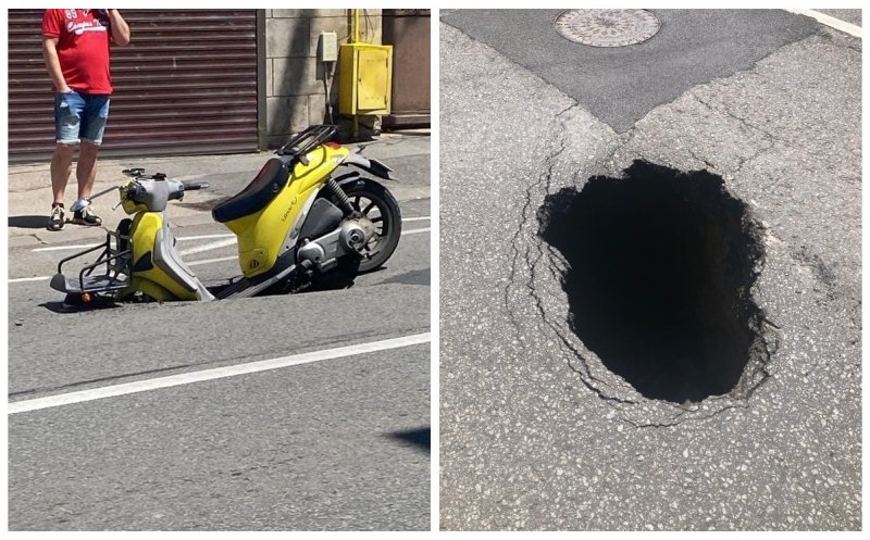 Foto O gaură uriașă s-a căscat în asfalt și aproape a "înghițit" un scuter, pe o stradă din Cluj-Napoca