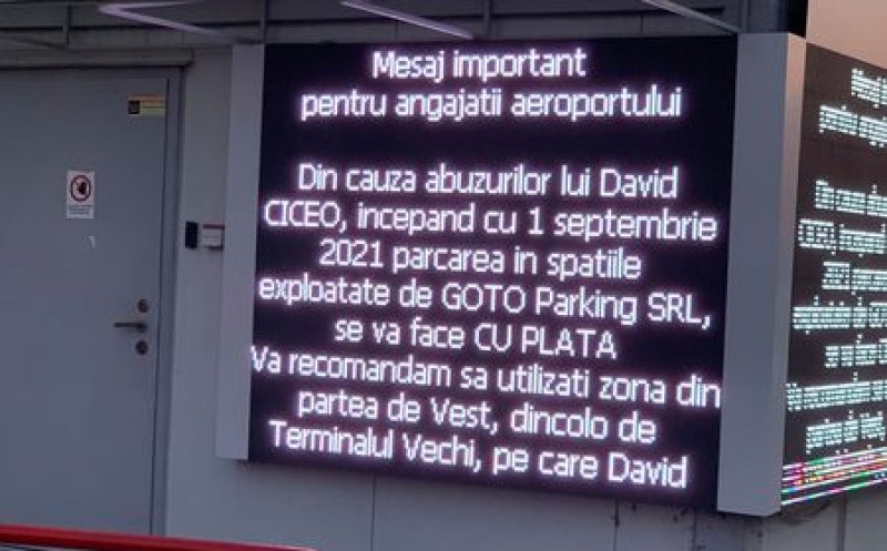 GOTO Parking, compania care administrează parkingul din fața Aeroportului Cluj, afișează, de câteva zile, pe ecranele publicitare de la intrarea în parcare, un mesaj prin care îi anunță pe angajații aeroportului că vor fi nevoiți să plătească dacă parchează pe locurile din fața celor două terminale: