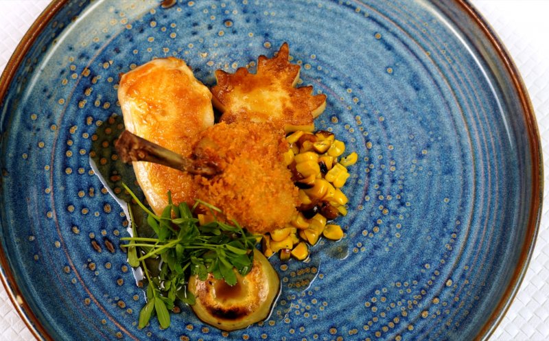4. Galiță de ocol: cocoșel cu porumb copt, cartofi confiați, ciupercă murată și sos brun servite alături de un pahar de Fetească Regală