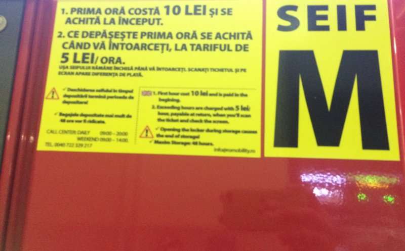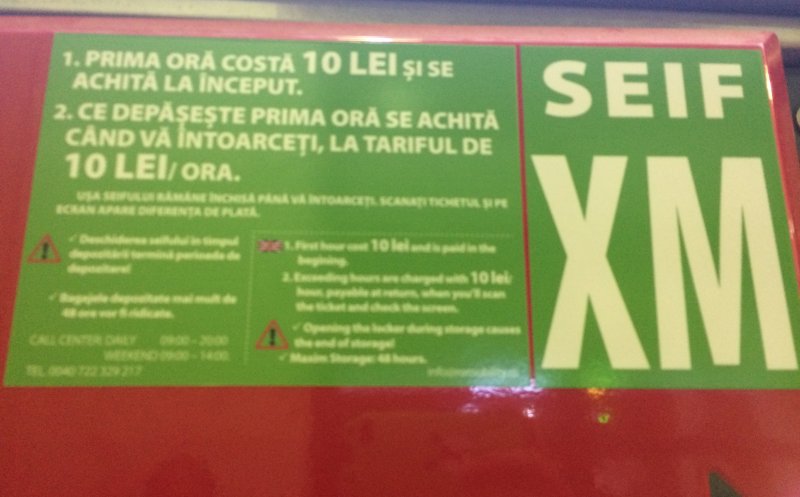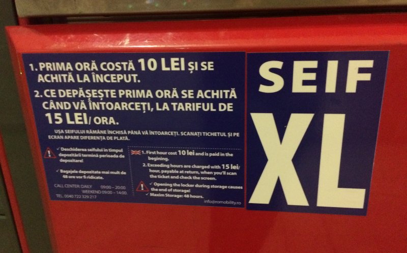 Pentru seifele cele mai mici - XM - tariful este de 10 lei/ora si apoi, fiecare ora, inca 10 lei, M - 10 lei/ora si apoi, 5 lei fiecare ora in plus si pentru XL - 10 lei/ora si ulterior, 15 lei/ora. Ce depaseste prima ora se achita la ridicarea bagajului. Bagejele depozitate mai mult de 48 de ore vor fi ridicate.